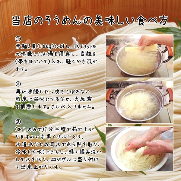 強いコシと喉ごしよい触感が特徴で、時間が経ってものびにくいので温かいにつゆに入れても美味しくいただけます。